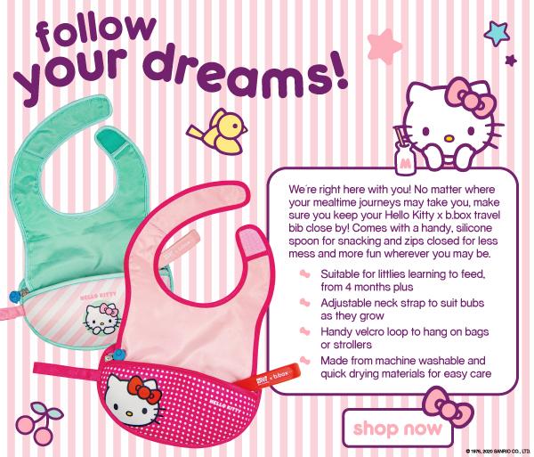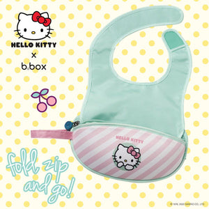 We’re right here with you! No matter where your mealtime journeys may take you, make sure you keep your Hello Kitty x b.box travel bib close by! Comes with a handy, silicone spoon for snacking and zips closed for less mess and more fun wherever you may be.