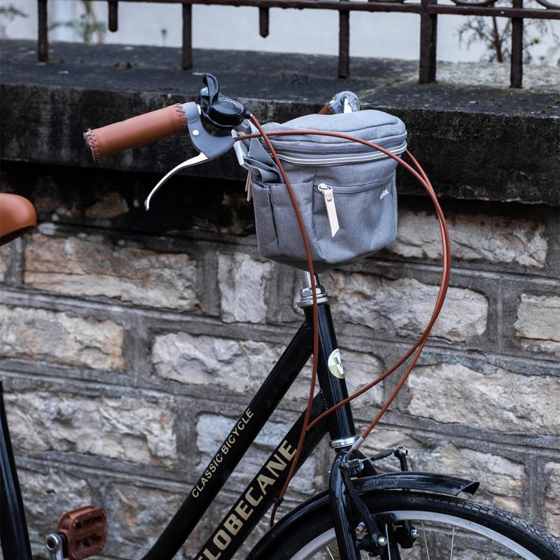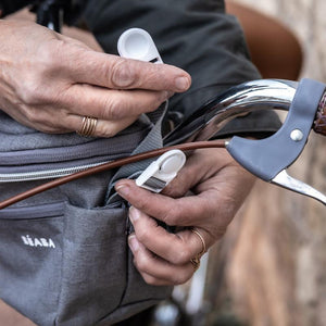 3 possible uses: on the handle bars of a stroller or bicycle as well as being carried with a cross-body strap