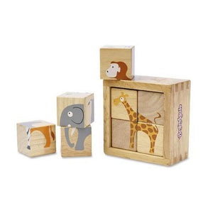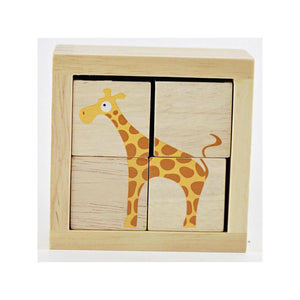This educational game for toddlers has four wooden block baby animal toy puzzle pieces, each side printed with one of six different safari animals: giraffe, elephant, lion, monkey, rhinoceros, and zebra.