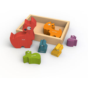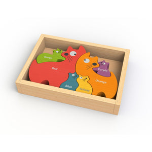The cat family puzzle is a wooden puzzle, learning toy, and character play set all in one! It’s a great first puzzle and helps develop fine motor and problem solving skills. The cat characters are great for inspiring storytelling. Parents and teaches will love introducing colors in both English and Spanish. Clean up is easy with the wooden storage box that is included.