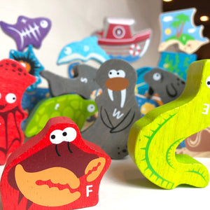 The ocean A to Z Puzzle is a wooden puzzle, alphabet learning toy, and character play set all in one! It’s a challenging preschool puzzle and helps develop fine motor and problem solving skills. The ocean characters are great for inspiring storytelling. Parents and teaches will love introducing letters, objects, and alphabet sequencing. Clean up is easy with the wooden storage box that is included.