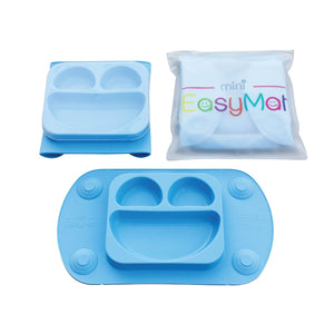 Universal fit small placemat with integrated happy face plate for high chair use. With 4 suction cups, folding sides, lid and carry case