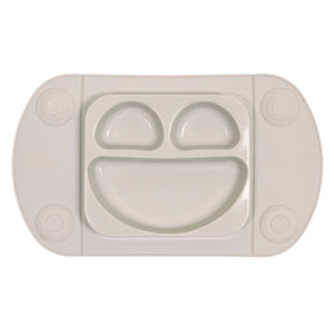 Universal fit small placemat with integrated happy face plate for high chair use. With 4 suction cups, folding sides, lid and carry case