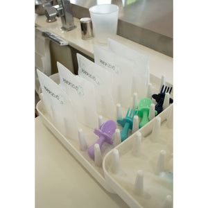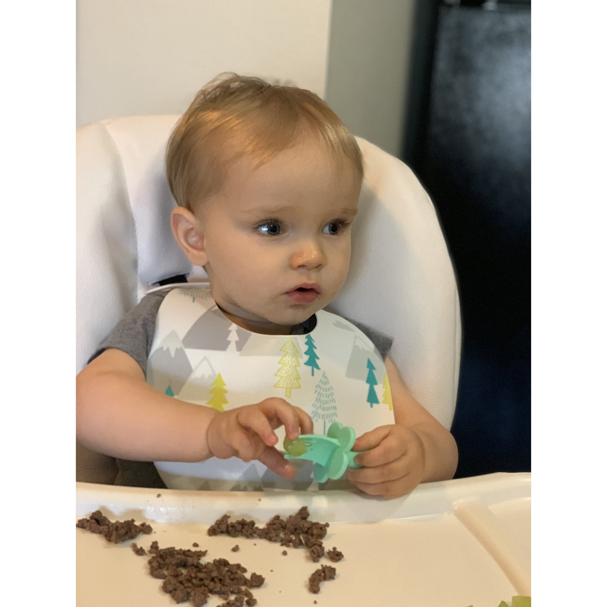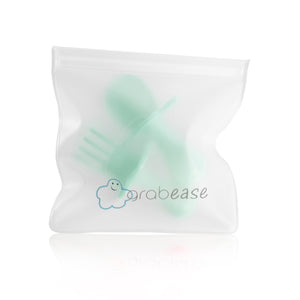 Help your little one position the handle in the center of their palm for a vertical grasp. The utensils feature a choke protection shield to add a layer of safety while your little one builds confidence in self-feeding. These utensils are the perfect learning tool for baby led weaning and beyond! Use the included EVA travel pouch to bring your utensils on the go, or as a reusable snack pouch!