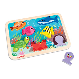 Thick chunky pieces make it easy for little hands to grab and hold on to. Chunky puzzle pieces are fun to play with on their own as well as fitting into their wooden puzzle board. Includes 7 marine life puzzle pieces plus board. Recommended for children aged 18-36 months.