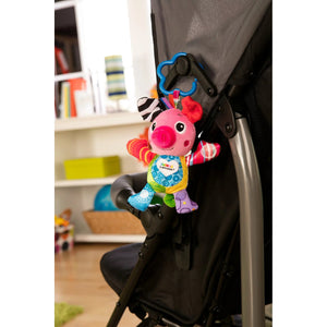 Olly Oinker is designed to promote bonding while helping baby develop visual, auditory and tactile skills, and is sure to keep your baby wiggling and giggling through teething. This piglet's colorful coat and contrasting patterns will captivate your kiddo and encourage them to explore and discover this little oinker's surprises. Crinkly ears and feet to grab, cheerful chimes to shake, and a soft tummy that oinks when squeezed will keep them entertained while rolling in the stroller or riding in the car. When teething begins, Olly's ready with ribbons and a textured teether to nibble and chew too.