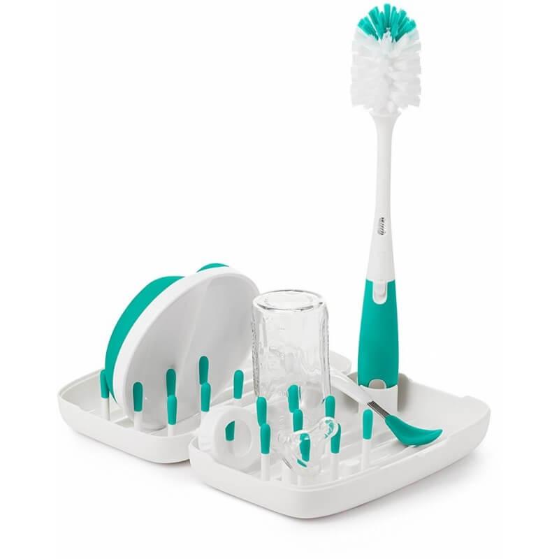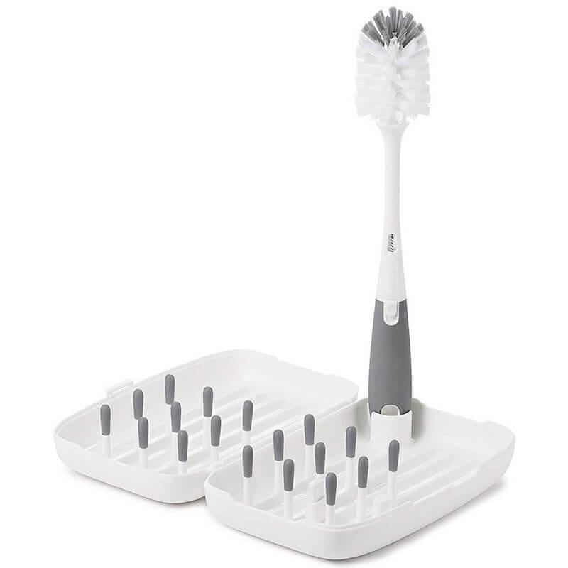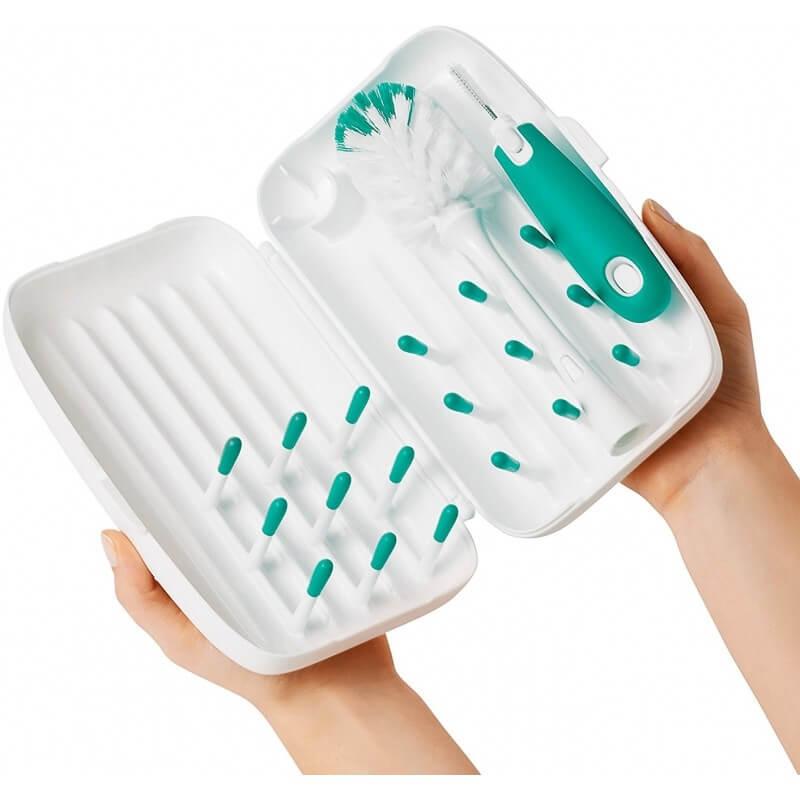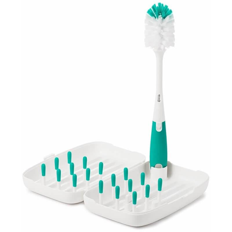 Features: Flexible tines accomodate bottles, breast pump parts and more. Kit includes a soft and firm-bristled brush for gentle cleaning or serious scrubbing and a Detail Cleaner for tight spots like bottle nipples. Ventilation holes provide aeration for quick drying - no more wet brushes in plastic bags! Fits easily into a diaper bag or a purse. Soft non-slip grip Top rack dishwasher safe BPA, Phthalate and PVC free.