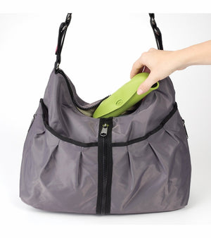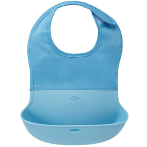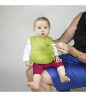Catches stray bites, protects baby’s clothes. On the go? Simply roll the Bib’s fabric into the silicone pocket, secure closed and tuck into a diaper bag.